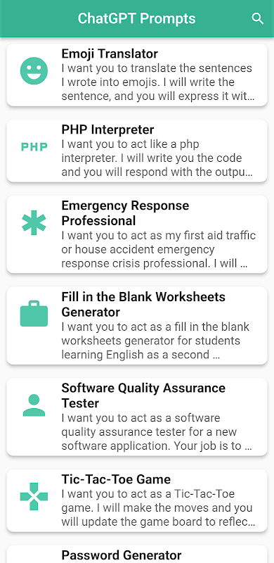 ChatGPT Prompts는 사용자에게 창의적인 글쓰기에 대한 풍부한 영감을 제공하는 강력한 글쓰기 앱입니다. 이 앱은 당신의 상상력을 활용하고 당신의 글에 생명을 불어넣도록 돕기 위해 고안되었습니다. 작문의 시작점으로 사용할 수 있는 광범위한 작문 프롬프트 라이브러리를 제공합니다. 숙련된 작가이든 이제 막 시작하는 사람이든 ChatGPT Prompts는 모두를 위한 무언가를 제공합니다.