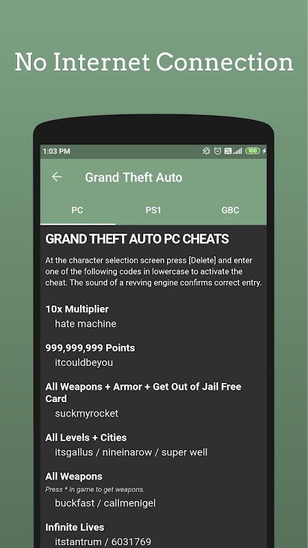 - It provides quick, easy access to a complete listing of all the cheat codes for every game in the GTA series , Console , PC and mobile device versions are all included .