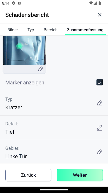 차량 점검용 앱을 사용하면 등록된 차량을 확인하고 개별 손상을 기록하거나 차량의 전체 상태를 기록할 수 있습니다.