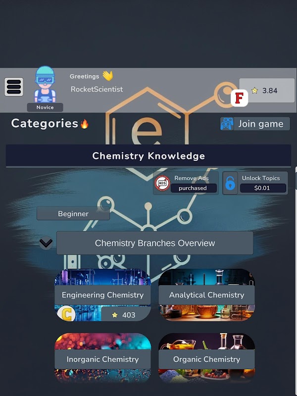 과학과 대화형 재미가 만나는 인기 무료 앱을 통해 매력적인 화학 세계로 매혹적인 여행을 떠나보세요! 당신이 신진 화학자이든 숙련된 열정자이든 이 교육 퀴즈 게임은 화학의 다양한 분야를 마스터하는 관문입니다.
