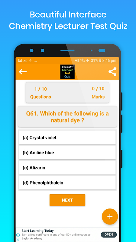 The app will help you in all kind of exams, tests and interviews. It will help you in MCQs-type Tests, Quiz-type interviews etc. The app covers almost all topics of chemistry at a moderate level.