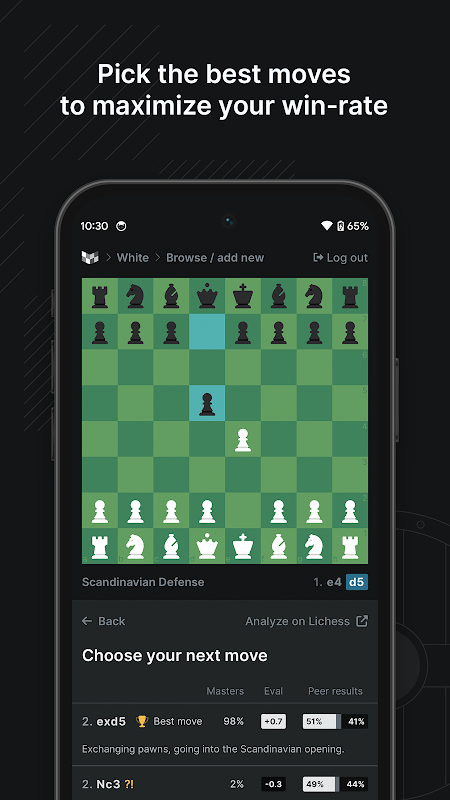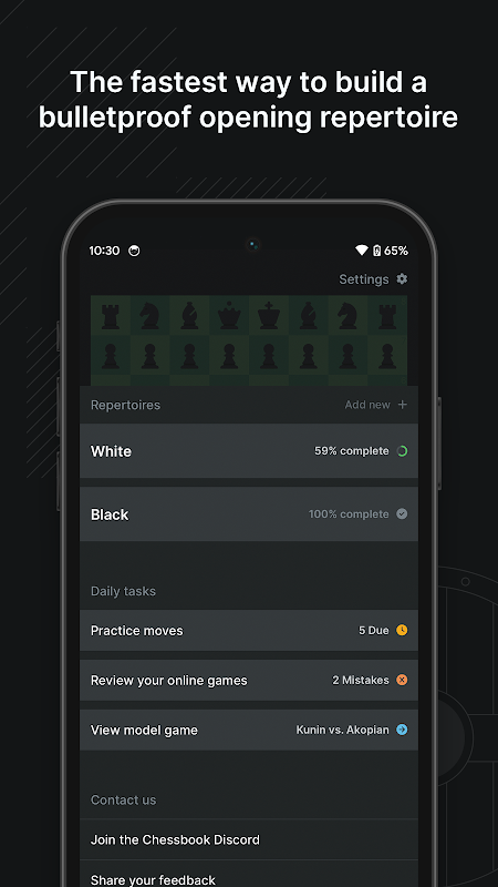 레퍼토리를 얼마나 잘 따르고 있는지 즉시 피드백을 받으세요. 체스북은 Lichess와 Chess.com을 모두 지원합니다.
