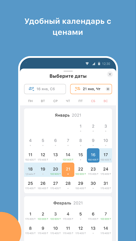 응용 프로그램은 티켓의 전체 가격을 보여줍니다. 항공사와 함께 정기적으로 프로모션 및 항공권 할인을 구성합니다. 항상 최저가를 알아두세요.