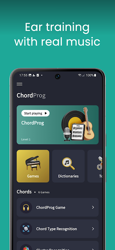 이 앱에는 음정 인식, 코드 인식, 음계 인식을 위한 연습 문제는 물론, 코드 진행을 인식하는 데 도움이 되는 연습 문제도 포함되어 있습니다.