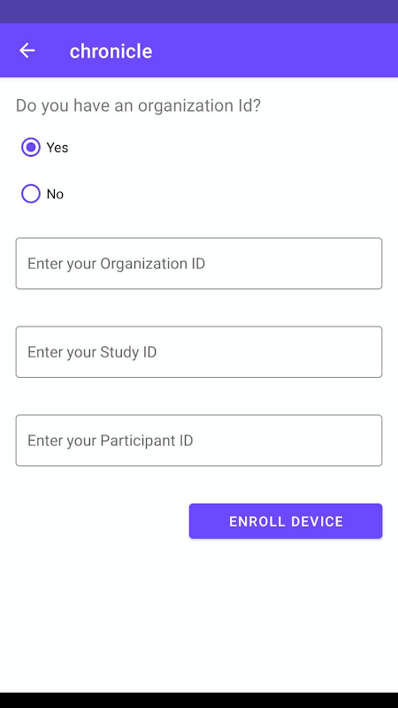 Chronicle에는 Android 장치를 위한 선택적 컴패니언 모바일 애플리케이션이 포함되어 있습니다. 이 앱을 통해 연구자는 미디어 사용 연구를 위한 정보를 안전하게 수집하고 특정 시점 설문조사에 푸시 알림을 활용할 수 있습니다.