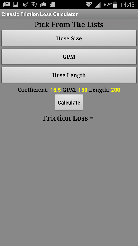 Classic version of the popular friction loss calculator for firefighters and pump operators. Easy to use pre-set drop down menus allow the user to pick Hose size / Coefficients, gallons per minute based on popular tip sizes and hose lengths in 50' increments up to 2000 feet.