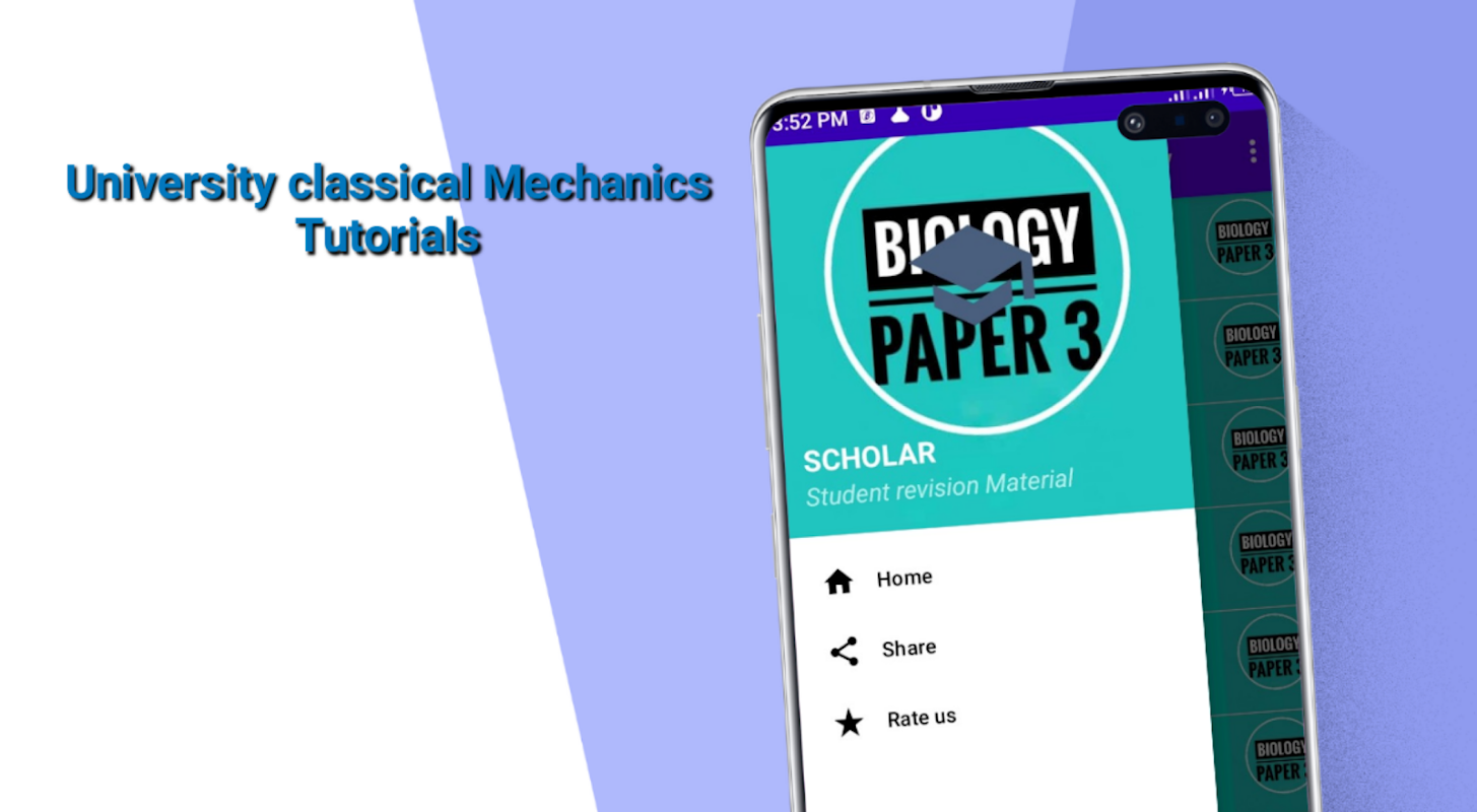 The application features classical mechanics notes plus self assessment exercises from the following topics