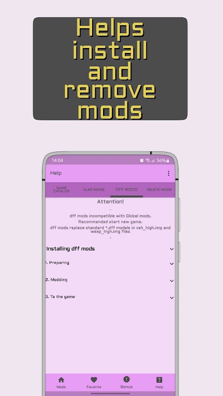 모드 및 dff 모델 설치에 대한 자세한 지침은 빠르게 시작하는 데 도움이 됩니다. 탭 한 번으로 설치된 모드를 제거할 수 있습니다.