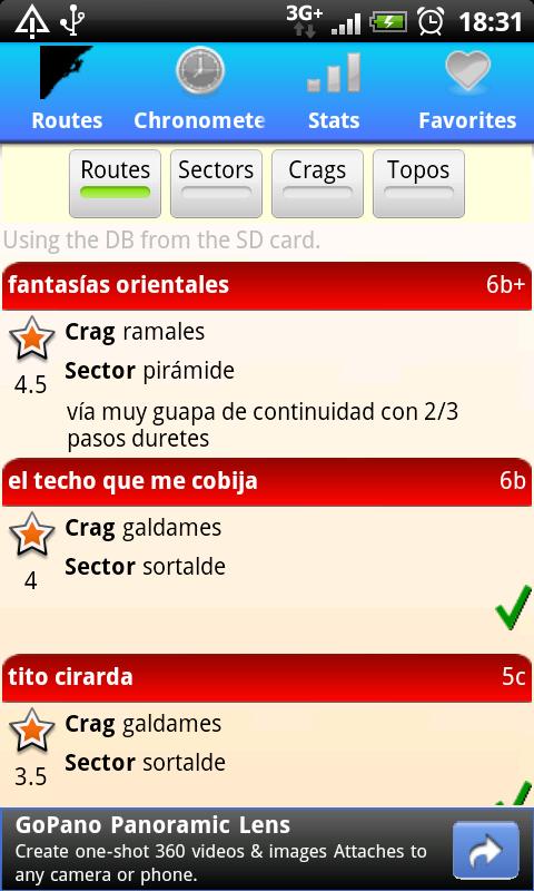 climbdroid는 당신이이 질문에 답하고 모든 트랙 (암벽 등반, 등산, 번체, 얼음 등반)가 올랐다 경로를 유지합니다. 당신이 원하는대로로 설명. 그것은 또한 당신에게 손을 당신이 일반적으로 방문하거나 새로운 것을 찾아 울퉁불퉁 한 바위와 섹터의 TOPOS를 갖는 옵션을 제공합니다.