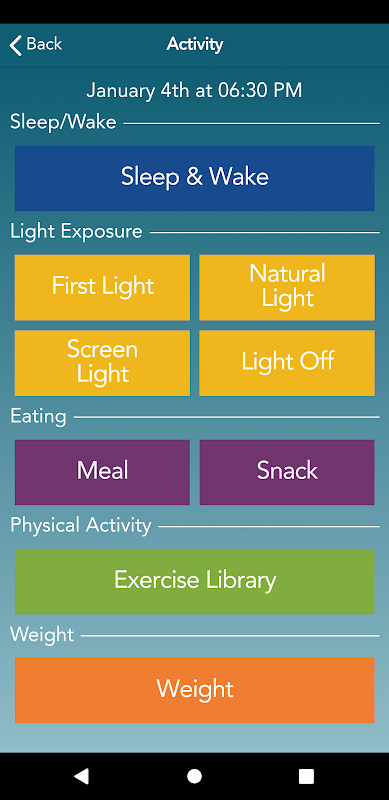 Clockwork는 연구 참여자가 일상적인 행동을 자체보고하여 생물학적 시계를 조절하도록 안내하는 앱입니다. 이 앱에는 참가자의 일상 활동을 다루는 다양한 보고서 주제가 포함되어 있습니다.