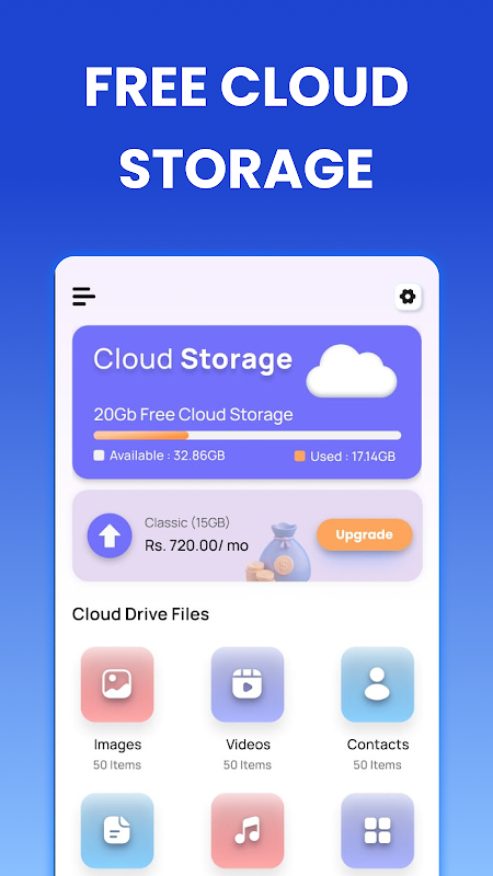 Cloud Storage app provides free storage space unto 10 GB. Getting cloud online storage is simpler with Cloud Drive. Free up storage in your phone by using our cloud drive storage! Copy data and make more space for you.
