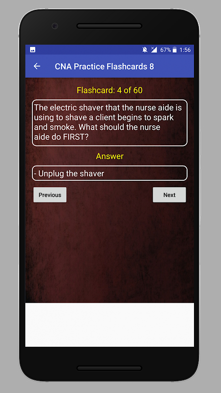 CNA 연습 시험 앱은 CNA 인증 시험을 준비 할 수있는 무료 플래시 카드 및 퀴즈 앱입니다. 2015 년, 2016 년, 2017 년, 2018 년, 2019 년 및 2020 년에 실시 된 실제 CNA 테스트의 질문이 포함되어 있습니다. CNA (Certified Nursing Assistant)는 의료 팀의 구성원입니다. 그 / 그녀는 정식 간호사 (RN) 또는 정식 간호사 (LPN)의 감독하에 일합니다. CNA에 사용되는 용어가 다릅니다. 그들 중 일부는 간호 조무사 (NA), 환자 치료 조교 (PCA) 또는 국가 시험 간호사 원조 (STNA)입니다.
