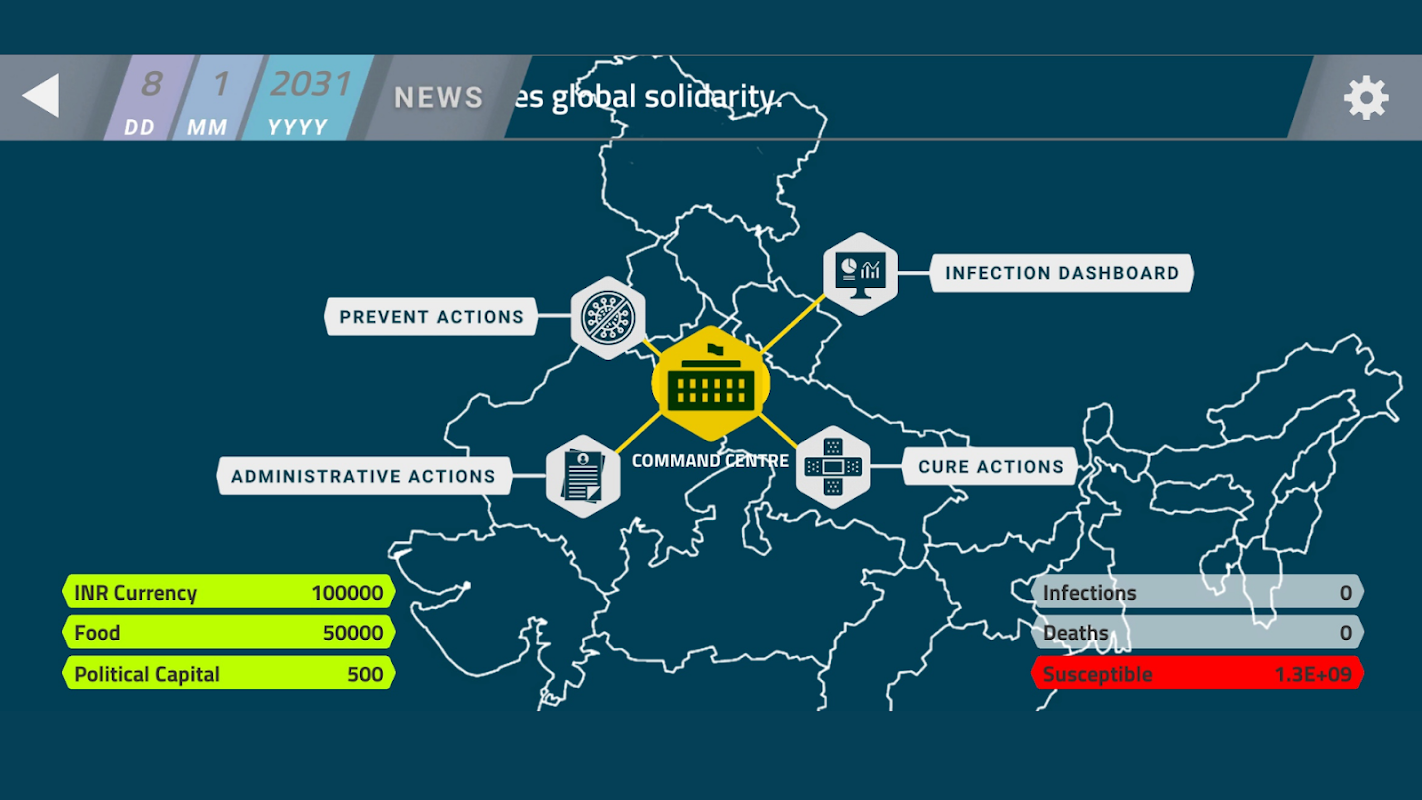 2031년으로 빨리 가십시오. 인류는 또 다른 종을 위협하는 전염병에 직면해 있습니다. 여러 번의 돌연변이 후에 새로운 코로나바이러스가 우리를 감염시키기 위해 돌아왔습니다. 이번에는 더 전염성이 강하고 치명적입니다. 당신의 나라는 그 어느 때보다 지금 당신의 지도력이 필요합니다. 정부의 수장으로 나서시겠습니까? 치명적인 바이러스를 근절하시겠습니까? 당신의 전략은 무엇입니까? 당신은 테스트하고, 추적하고, 치료할 것인가? 13억명에게 예방접종을 하시겠습니까? 엄격한 봉쇄를 시행할 것인가? 아니면 바이러스가 무자비하게 흘러가도록 내버려 둘 것인가?