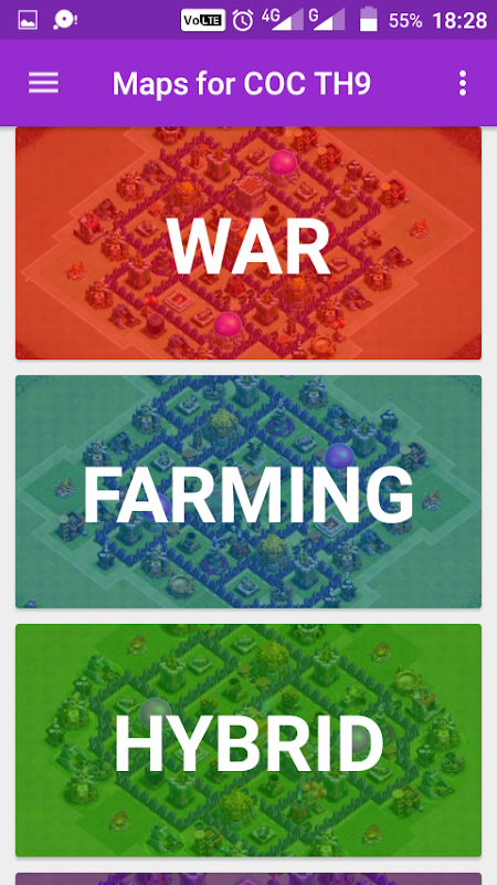 New Base Maps for Clash of Clans TH9 is Free Application in Strategy Category, in this App I want to help Clash of Clans to build base layout in 2017. in this App included top base layout and best war layout and any other to get inspiration how to build strongest Base Layout in four base in this App. for example is War Base Layout, Farming Base Layout, Hybrid Base Layout, and Trophy Base Layout.