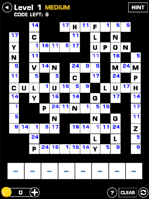 Codebreaker Puzzle (Codeword) is a great word game that challenges you replace a code ( a number ) by a letter to complete a word.