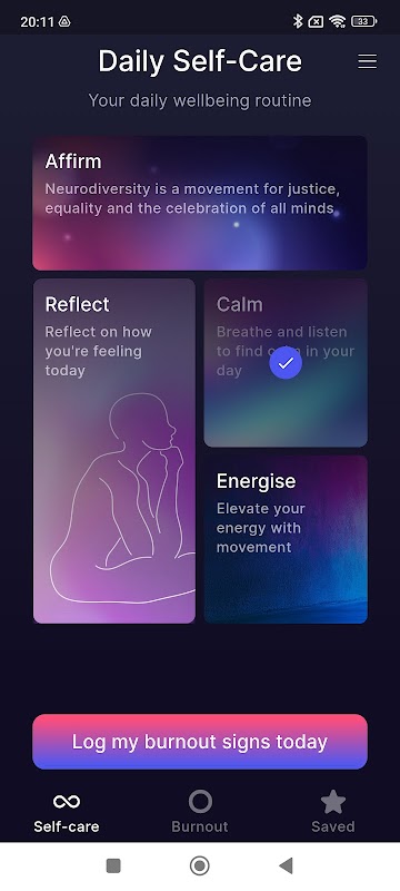 Cogs는 반성, 움직임, 호흡 및 자극을 통해 올바른 일상 습관을 자가 조절하고 유지하는 데 도움이 됩니다. 자신에게 적합한 것을 찾았으면 나중에 사용할 수 있도록 저장해 두세요. 이는 자기 관리 화면에 표시됩니다.