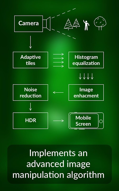 Remember, this night mode camera application does not provide the capabilities of a real night vision device. It just improves the brightness of the camera in the dark and is meant to be used for fun. The final result depends on the camera quality on your phone. The algorithm works well while using high quality phone camera as compare to low quality phone camera.