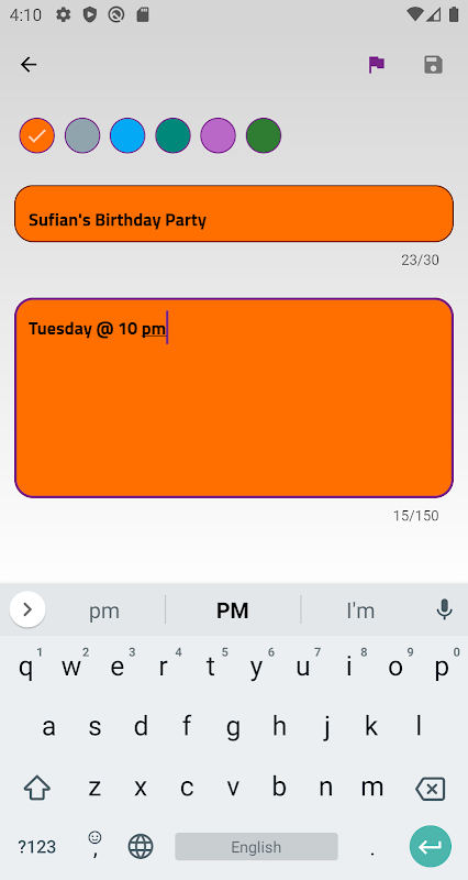 - Click on the (+) icon to add a new note, choose a color and fill in the title and description of the note, you can also mark the note as important if you want.