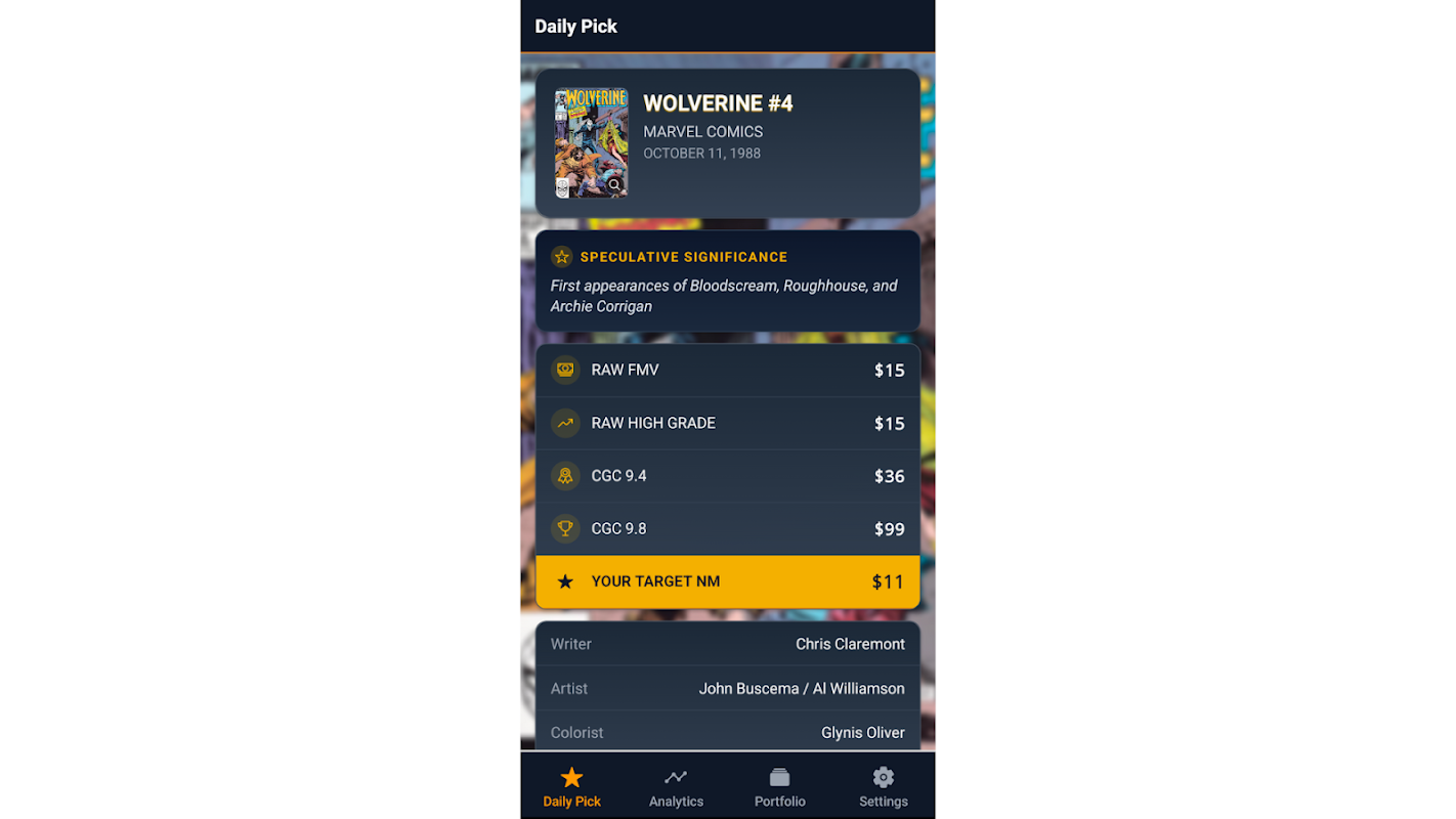시장 상황, 등급이 매겨진 만화책 재고 여부, 그리고 추천 이유를 명확하게 제시하는 엄선된 만화책 추천을 매일 받아보세요. 코믹 인덱서는 현재 저평가되어 있을 가능성이 있는 만화책을 찾아내고, 적절한 가격에 구매하여 등급을 매길 경우 얻을 수 있는 잠재적 가치 상승분을 알려드립니다.