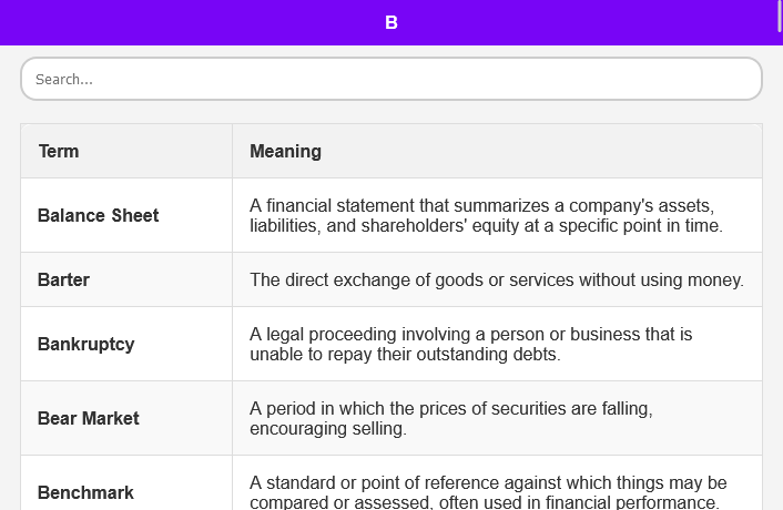 검색 기능: 이 상업 사전 앱에는 빠른 검색 기능이 있습니다. 용어를 검색해야 합니까? 강력한 검색 기능을 사용하여 정의와 의미를 즉시 찾아보세요. 이를 통해 상거래 용어를 쉽게 연구하거나 조사할 수 있습니다.