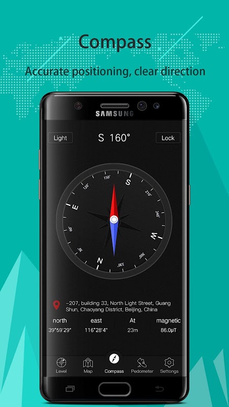 Compass is a small memory, provincial software, to help you identify the direction, easy to use, smooth picture. Use the compass to keep you away from the direction and give you accurate positioning and direction! Exquisite 360° compass rotating compass style, level measuring tool! It can display the current position, latitude and longitude, and also display altitude, air pressure, magnetic field strength, and horizontal tilt angle! And also added a new map function, real-time positioning, you can know your current location and floor plan. It is a must-have software for outdoor users to customize the direction of outdoor travel, and is an essential artifact for your wilderness adventure.