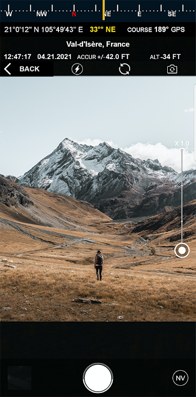 -야간 모드 향상 및 줌 기능이있는 사진 카메라. 위치에 대한 이름과 전체 정보가 촬영 된 사진에 표시됩니다.