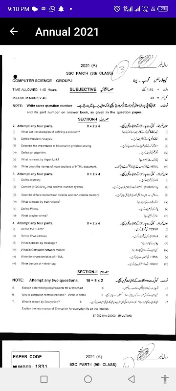컴퓨터 공학 9학년 MCQ, 영어 및 우르두어로 된 노트 및 종이 생성기