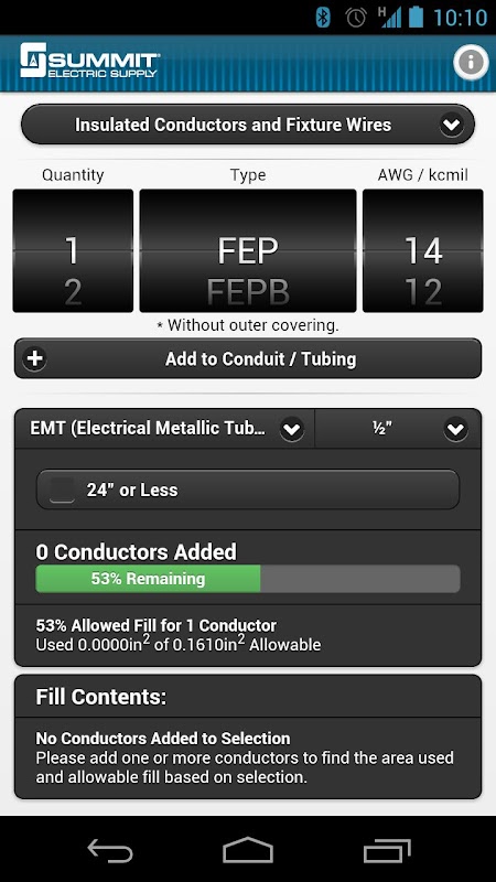 As you add and remove conductors, the app automatically calculates the permitted fill rates from the 2011 NEC, keeping you within code. Allowable fill rates adjust automatically for differences in conductor count and for conduit or tubing lengths of 24” or less.