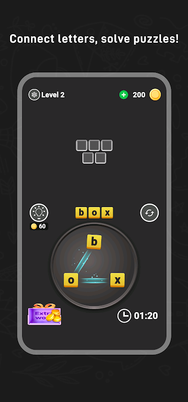 플레이어의 언어 능력과 정신적 민첩성을 테스트하기 위해 고안된 단어 도전 퍼즐 게임입니다. 이 게임에서 플레이어는 화면에 있는 문자 타일을 연결하여 유효한 영어 단어를 최대한 많이 생성해야 합니다. 각 타일에는 문자가 하나씩 있으며, 플레이어는 손가락을 밀어서 이 문자를 올바른 순서로 연결하여 단어를 만들 수 있습니다.