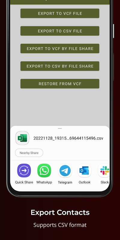 VCF 또는 CSV 형식의 연락처를 스토리지 또는 파일 첨부가 있는 앱으로 내보냅니다.
