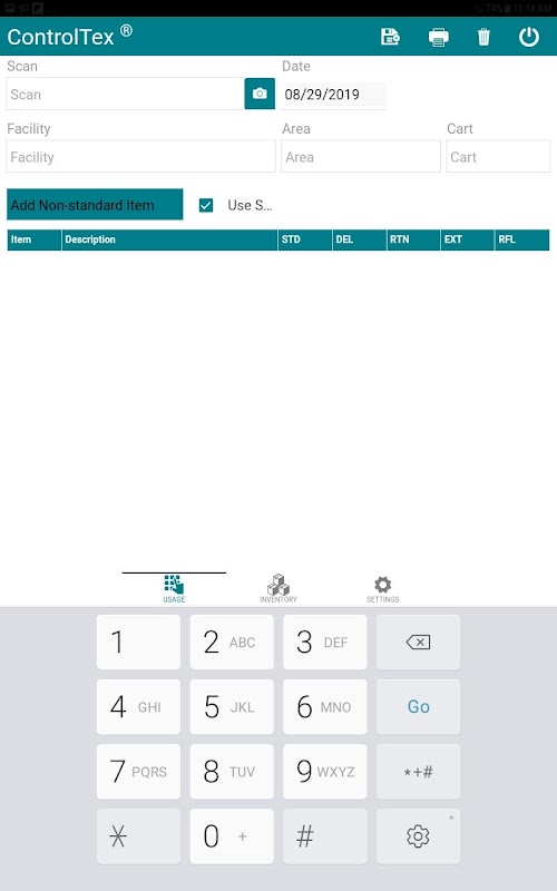 ControlTex®는 린넨 사용, 재고, 유통, 관련 비용을 모니터링하고 관리하는 데 사용할 수있는 정교한 웹 기반 소프트웨어 응용 프로그램입니다. 안드로이드 OS에 대한 ControlTex 사용 데이터 입력 응용 프로그램은 하나의 이동이 편리 화면에 필요한 모든 것을두고 유선형 디자인을 제공합니다. 항목 리필 수량 린넨 카트와 옷장을로드하는 데 필요한 모든 정보를 한 눈에 액세스를 제공 표시됩니다. 그것은 리넨 직원이 버튼을 탭에서 ControlTex® 사용 형태를 스캔 장치 카메라를 사용할 수 있습니다.
