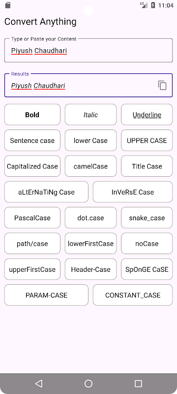 Convert Case는 텍스트를 다양한 케이스와 스타일로 쉽게 변환하도록 설계된 다용도의 사용자 친화적인 앱입니다. 텍스트를 대문자, 소문자, 제목 케이스 또는 풍선 텍스트와 같은 보다 독특한 형식으로 변환해야 하는 경우 대소문자 변환을 사용하면 됩니다. 소셜 미디어 게시물, 창의적인 프로젝트 또는 일상적인 글쓰기에 적합한 이 앱은 텍스트를 항상 돋보이게 해줍니다. 직관적인 인터페이스, 실시간 미리보기, 모든 요구 사항에 맞는 다양한 사용자 정의 옵션을 통해 원활한 경험을 즐겨보세요.