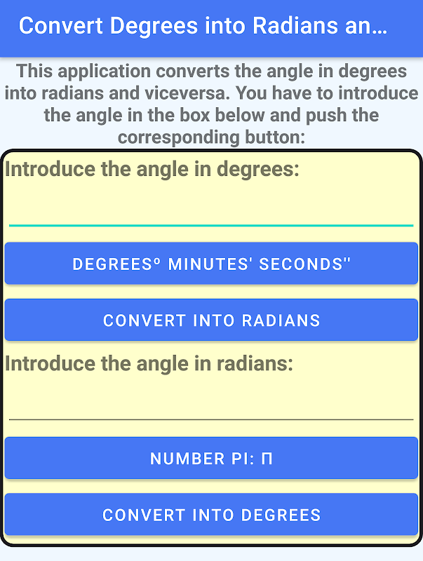 This application converts an angle in degrees to its equivalent in radians and viceversa.