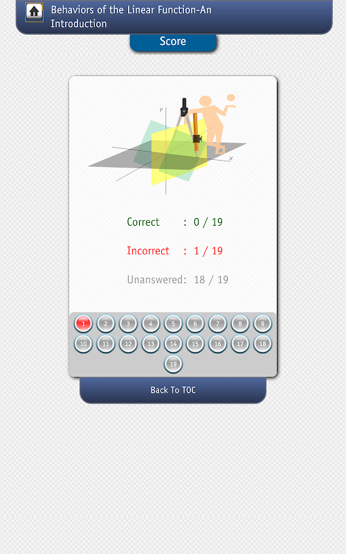 애플 리케이션은 객관식 문제로 만들어 수업으로 구성되어, 당신이 질문에 대답 할 때, 당신은 즉각적인 응답을받을 수 있습니다. 객관식 시험과는 달리, 앱 수업은 교육 도구로 객관식 문제를 사용합니다. "대수 기능을 통해"시리즈 5 애플 리케이션을 포함, 41 내장 교훈이있다.
