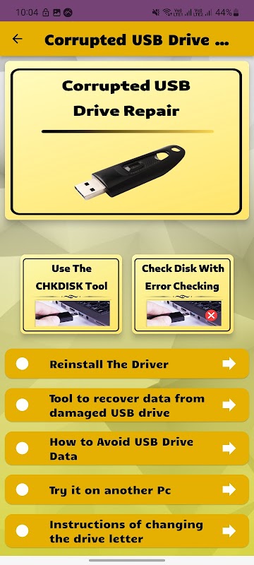 릴 수리 손상된 USB 드라이브. 깨진 USB 스틱을 수정하는 방법 및 데이터 복구 방법 가이드. 이 앱에서 모든 손상된 USB 드라이브 문제에 대한 솔루션을 얻을 수 있습니다.