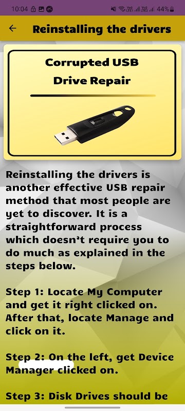 손상된 USB 드라이브 복구 방법 가이드 응용 프로그램을 제시합니다. 손상된 USB 드라이브 복구 방법 가이드 응용 프로그램을 제시합니다. 이 응용 프로그램은 손상된 USB 드라이브를 수리/수리하고 데이터를 복구하는 방법을 알려줍니다. USB 드라이브를 수정하거나 수정하는 방법을 배울 수 있습니다.
