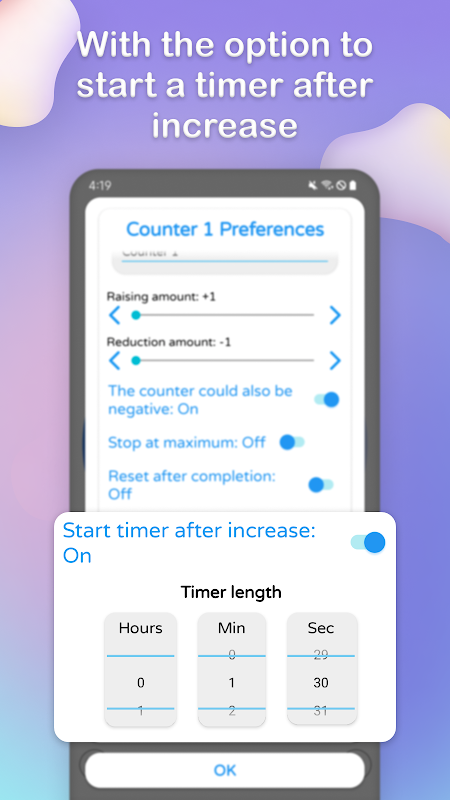 * 카운터를 늘리거나 줄인 후 타이머를 시작하는 옵션(설정 시간 포함)