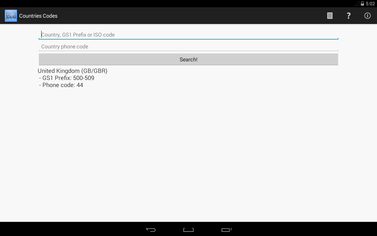 So, with this app you can know the correspondent country of a GS1 code, ISO code or phone code. Simply type the first three digits of the bar code (the GS1 code) or the ISO code in the search bar and press Search! To know the correspondent country of a phone code, type it on the second search bar and press Search! You can also type a country on the first search bar to know all its codes.