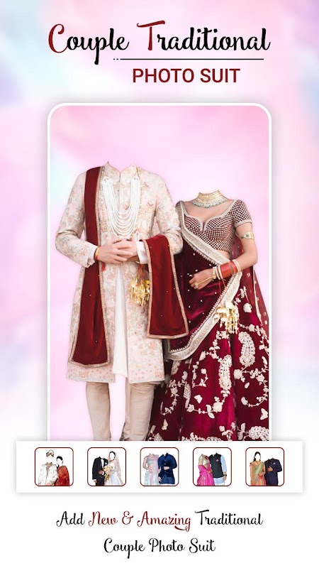 Wedding couple suits designer collections can be found inside this best traditional couple photo suit app. Try many variety of marriage suites for best couples with HD Suit Images and HD Couples Background. Boys and girls can see themselves with their beloved persons inside one love couple photo frame and have a best vision of wedding couples.