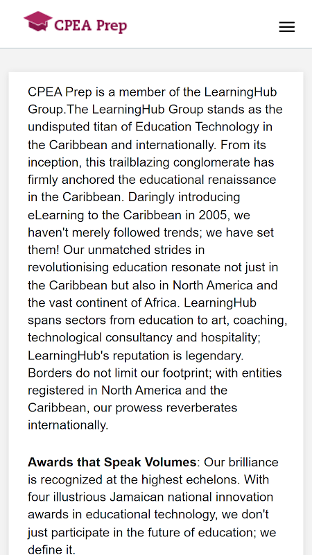 CPEPrep은 학생들이 CPEA(Caribbean Primary Exit Assessment)를 준비하도록 돕는 데 중점을 두고 있습니다. 우리의 독점 강좌는 학생들이 전체 CPEA 커리큘럼을 다루고 내용을 마스터할 수 있도록 고안되었습니다. 학생들에게 연중무휴 사전 테스트, 수업, 전자책, 메모, 과제, 퀴즈 및 모의 시험에 대한 액세스를 제공하는 것 외에도 학생들은 실시간 튜토리얼에 액세스하여 기술을 연마하고 CPEA에서의 성과를 향상시킬 수 있습니다.