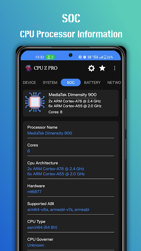 ➡️ SOC: 장치에 어떤 처리 칩이 있는지 알아보고 프로세서 이름, 코어, 아키텍처, 클러스터, 하드웨어, 지원되는 ABI, CPU 유형, CPU 거버너, 클럭 속도, BogoMIPS, CPU 실행 빈도와 같은 사용자 매개변수에 대한 정보를 얻습니다. GPU 렌더러, GPU 공급업체, GPU 버전 세부정보