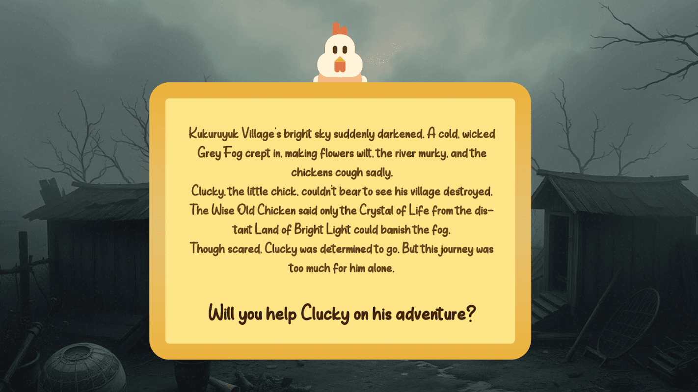 평화로운 쿠쿠루유크 마을에 끔찍한 회색 안개가 덮쳤습니다! 닭들은 병들었고 꽃들은 시들었습니다. 용감한 꼬마 닭 클러키가 마법의 생명의 수정을 찾기 위한 위험한 여정을 떠나기 위해 여러분의 도움이 필요합니다!