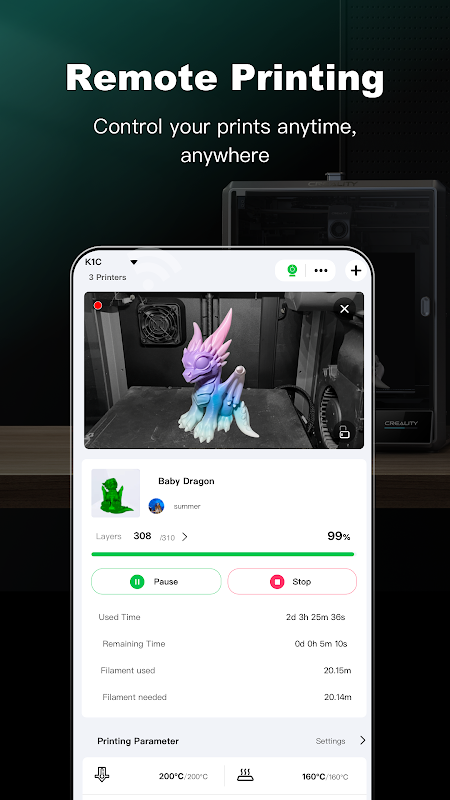 - 모바일 기기를 사용하여 어디서나 3D 프린터를 제어하고 관리하세요.
