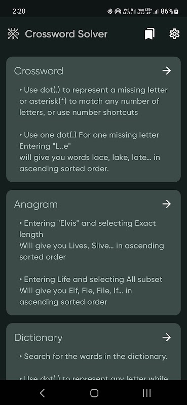 Crossword Solver는 300,000개가 넘는 영어 단어의 오프라인 카탈로그로 Crossword 및 anagram 퍼즐을 풀기 위한 도구입니다. 십자말 풀이에 붙어 있다면 정말 도움이됩니다. 단어 게임을 위한 단어를 만듭니다. 모든 단어 게임에서 승리하기 위해 빠른 검색 기능을 갖춘 거대한 오프라인 데이터베이스 세트로 시간을 이기십시오!