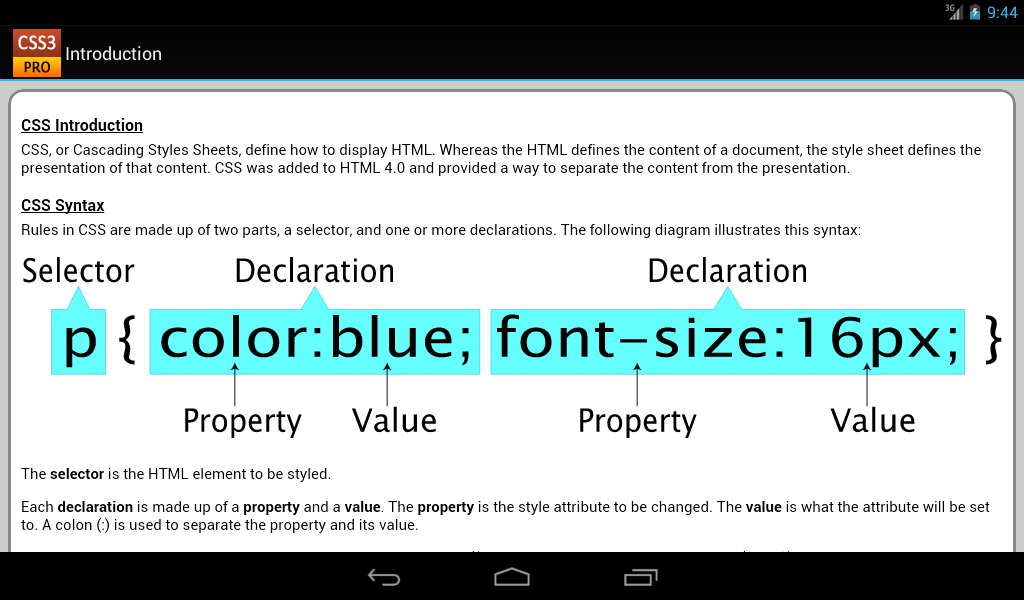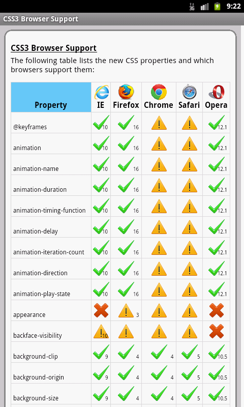 CSS와 CSS3 속성을 분류 및 검색 할 수 있습니다. 각 속성 정보 화면은 속성 설명을 포함, 속성이 허용 예, 브라우저 호환성 및 버전 정보를 값. 또한, 몇몇 특성은 다양한 속성 값의 표시 결과 (예 테두리 스타일, 문자 장식, 등)를 포함한다.