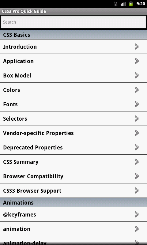 The CSS and CSS3 properties are categorized and searchable. Each property information screen contains a property description, values the property accepts, examples, browser compatibility, and version information. In addition, some properties include the display results of the various property values (e.g. border styles, text decoration, etc.).