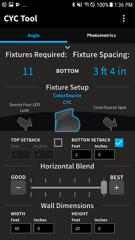Swipe up on the toolbar to select your ETC fixture (Source Four® LED Series 2 Lustr® with CYC adapter, ColorSource® Spot with CYC adapter, or ColorSource CYC), and then enter the setback (distance from the cyc) for your fixtures, either top-hung, ground-row, or both. After you enter the dimensions of the cyc that you're lighting and set your horizontal blend, the CYC Tool determines how many fixtures you need and how far apart to place the fixtures.