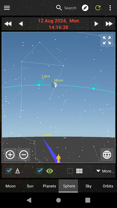 상세한 데이터 외에도, 간단하고 직관적인 천구도에서 달, 태양, 그리고 8대 행성의 위치를 자유롭게 회전하며 관찰할 수 있습니다.