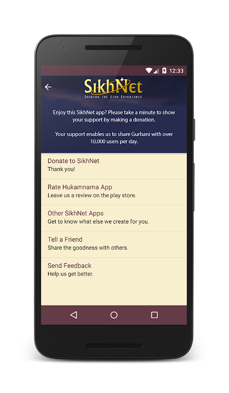 이 응용 프로그램은 SikhNet 사용자가 개별적으로 기부 한 지원을 통해 제공됩니다. SikhNet은 1995 년부터 인터넷을 통해 전 세계 시크교 공동체를 연결하는 데 도움을주었습니다. 우리는 구루 (Guru)의 마음과 지혜를 서로 쉽게 연결하는 사람들을위한 플랫폼입니다.
