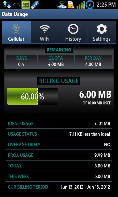 당신이 청구주기의 15 일에 매달 계획을 200 MB의 경우 예를 들어, 당신의 이상적인 사용이 1백메가바이트 될 것이다. 결제주기의 특정 시점에서 이상적인 사용을 통해려고하는 경우, 기본적으로 진행률 표시 줄이 노란색으로 바뀝니다.